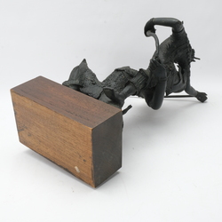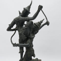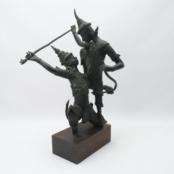 | Omschrijving | Een groot Indonesisch bronzen beeld, voorstelling van twee vechtende krijgers met lotusbloem in de hand, op houten sokkel. 52 cm hoog |
