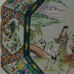 | Omschrijving | Een grote Japanse achtkantige schotel, ca. 1900, met emaille beschildering van vrouw en kind in kar, voortgetrokken door hert, en een vrouw naast twee kraanvogels. Op de rand decor van vogels en vlinders in medaillon. Op de achterzijde gesigneerd |