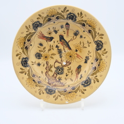 | Omschrijving | Een koud beschilderde aardewerken schotel. Met een decor van diverse voorstellingen met vogels en bloemen. Vervaardigd door het NAW (Nijverheids Atelier Workum) JH voor Jopie Huisman. Ca 1952. |