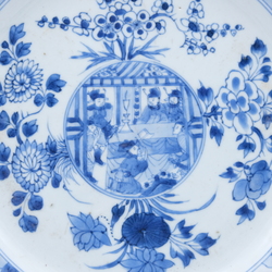 | Omschrijving | Een 18e eeuws Chinees porseleinen bord, Kangxi periode (1661-1722) met voorstelling van figuren in een interieur in medaillon en op de rand |