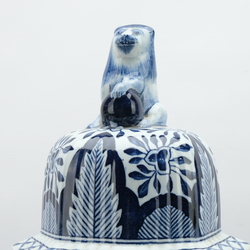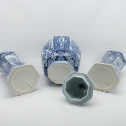 | Omschrijving | Een uitzonderlijk groot 20e eeuws blauw-wit kaststel, twee trompetvormige zeskantige vazen en één balustervormige zeskantige dekselvaas bekroond met leeuw. |