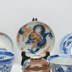 | Omschrijving | Lot divers Chinees porselein: negen schotels, zes kopjes en een 18e eeuws capucijner dekselpotje |