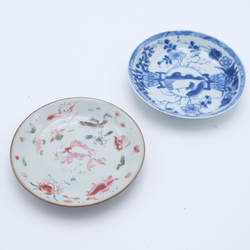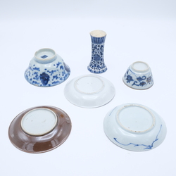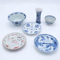 | Omschrijving | Lot divers Chinees porselein: een 18e eeuws blauw-wit Kangxi vaasje, een Famille Rose capcuijner schoteltje, twee 18e eeuwse blauw-wit schoteltjes, een 18e eeuwse kop en een 19e eeuwse kom |