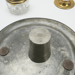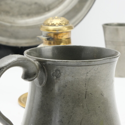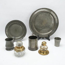 | Omschrijving | Lot divers: twee kristallen inktpotten met koperen montuur en vijf stuks antiek tin. Een Engelse Pint, gegraveerd met initialen, een Engelse half Pint, een bekertje gemerkt Kamphof Zwolle en twee tinnen borden. |