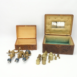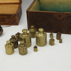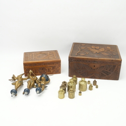 | Omschrijving | Lot divers: twee 20e eeuwse Fries kerfsnede kistjes, een metalen Atlas en twee bazuinblazende engelen voor op een Friese klok en dertien geijkte messing gewichtjes |