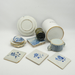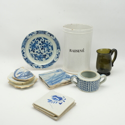 | Omschrijving | Lot divers aardewerk en glas: een 18e eeuws Engels aardewerken bord, een boterpot, pot met opschrift 'Raisin', 18e eeuws Engelse glazen mok, vijf tegels, waaronder drie Friese bloemtegels en twee Portugese tegels uit een tableau, en drie scherven van aardewerken borden |