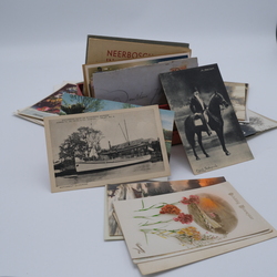 | Omschrijving | Lot diverse ansichtkaarten. Enkele kaartjes gemerkt Thee- en koffiehandel Cock Sneek & Lange Workumer Koekfabriek, een ansichtkaart met dir. Albert Carré op een paard en enkele omgeving Coevorden |