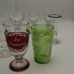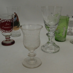 | Omschrijving | \Lot diverse sierglazen, waaronder een gegraveerde kristallen bokaal, Richard Süßmuth, met spreuk 'Ich Lechze nach erfrisahung' en familiewapen, een Mary Gregory glas, een glas met Scheveningse visvrouw en tekst 'Aaltje Kemps' en datering 1910. |