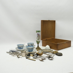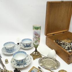 Lot diversen, waaronder drie 18e eeuwse kop en schotels, rozenkranzen, naaigerei etc.
