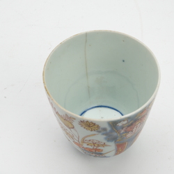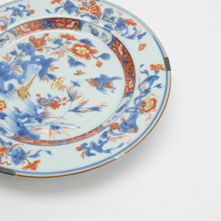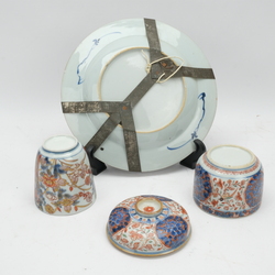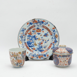 | Omschrijving | Lot van drie stuks 18e eeuws imari: een wandbord met decor van kostbaarheden en een vogel op een rots op het plat, een dekselpot met Amsterdams Bont decor van vogel en een 18e eeuwse Japanse chocoladekop |