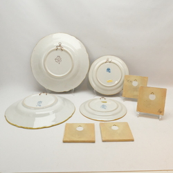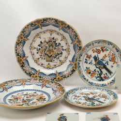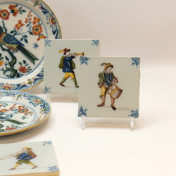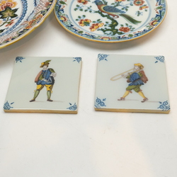 | Omschrijving | Lot divers 20e eeuws Tichelaar Makkum: twee grote 20e eeuwse polychroom gedecoreerde borden, één met decor van bloemenmand en één met decor van vogel op tak. Beide tweede keus, doorsnede 35,5 cm. Met daarbij twee kleine wandborden, polychroom decor van papegaai op tak, doorsnede 24,5 cm. En vier tegels, voorstelling van muzikanten, allen gemerkt Tichelaar Makkum |