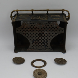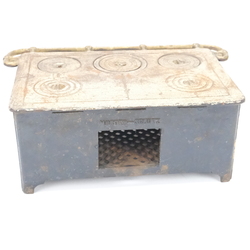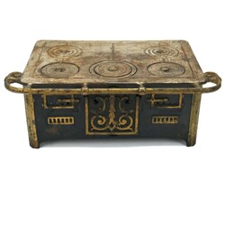 | Omschrijving | Een antiek gietijzeren miniatuur fornuisje, gebruikt als demonstratiemodel aan het eind van de 19e eeuw. Gemerkt ‘Muster-Schutz’ |
