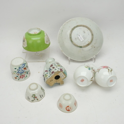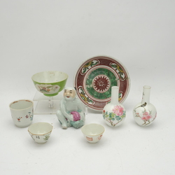 | Omschrijving | Lot van negen stuks Chinees porselein. Bestaande uit een swatow schotel, Sculptuur van een zotje, kopjes, kom en twee eierschaal pijpvaasjes. 18e, 19e en 20e eeuws. |
