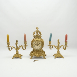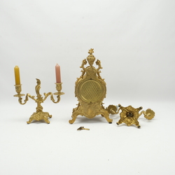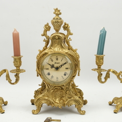 | Omschrijving | Een 20e eeuwse bronzen tafelpendule, gemerkt 'Hepa Made in Italy' op de wijzerplaat. Met twee tweelichts kandelaars in Louis XV stijl. |