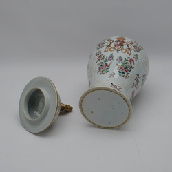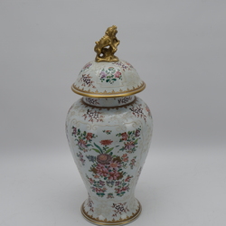 | Omschrijving | een 19e/20e eeuwse porseleinen dekselvaas, floraal beschilderd en met familiewapen, deksel bekroond met foodog. Frans, Samson |