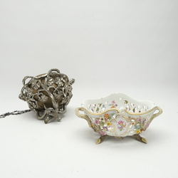 | Kavel | 624. Porseleinen mand op voetjes en een bloemhanger. |