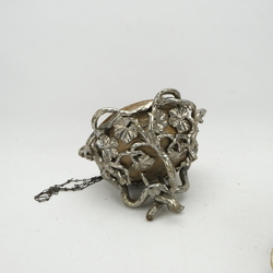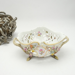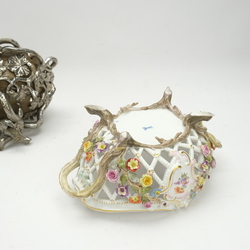 | Omschrijving | Een porseleinen soezenmand, opengewerkt en rondom versierd met diverse florale decors.Gemerkt met de twee gekruisde zwaarden voor Meissen. Hierbij een Duits aardewerken bloemhanger met takken decoratie. Aan originele ketting. |