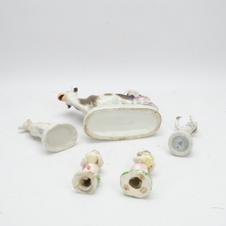 | Omschrijving | Lot diverse porseleinen sculpturen: een 19e eeuwse Staffordshire sculptuur in de vorm van een vrouw met koe, een Napoli beeldje van een putti, een 19e eeuws sculptuur van een windhond en twee 18e eeuwse Derby porseleinen putti's met bloemenmandjes |