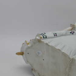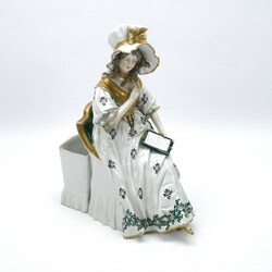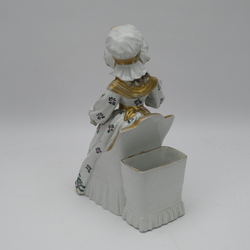 | Omschrijving | Een 20e eeuws porseleinen sculptuur, voorstelling van een vrouw op stoel. Gemerkt gekroonde N (Heubach of Capodimonte) |