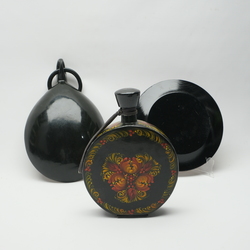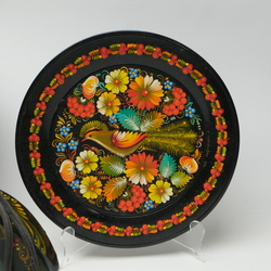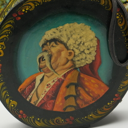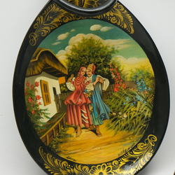| Omschrijving | Lot van drie stuks Russisch lakwerk: een houten kruik met voorstelling van man, een schaal met dansend koppel en een bord. Allen gesigneerd |