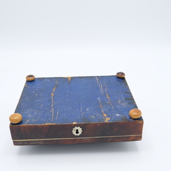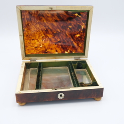 | Omschrijving | Een antieke 19e eeuwse schildpad theegarnituurdoos, geplaatst op bolpootjes. Bestemd voor zilveren theelepeltjes, theeduimpje, en suikerschepje (niet aanwezig). Binnenin met spiegel. |