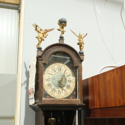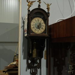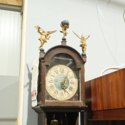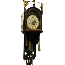 | Omschrijving | Een 19e of 20e eeuwse eikenhouten staartklok, zgn. schippertje, met drie houten poppen. Wijzerplaat beschilderd met zeilschepen. |