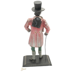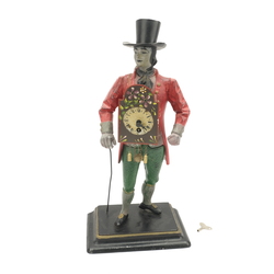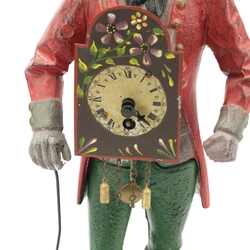 | Omschrijving | Een 20e eeuwse metalen tafelklok, voorstelling van een man met hoed met een klok op zijn rug en buik. |