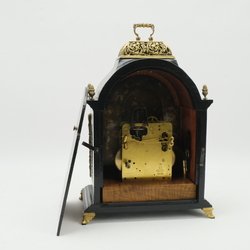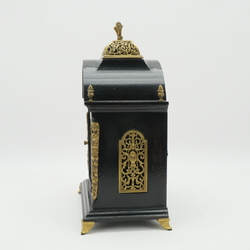 | Omschrijving | Een 20e eeuwse zwartgelakte tafelpendule met messing ornamentiek. Maanstand boven de wijzerplaat, gemerkt 'Daniels 1881'. Tekst op uurwerk '2 jewels - made in West-Germany - unadjusted'. |