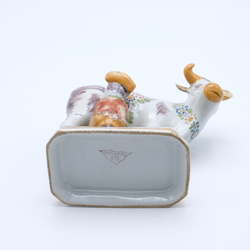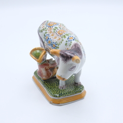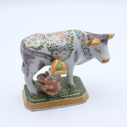 | Omschrijving | Een 20e eeuws polychroom aardewerken sculptuur, melkende boer bij koe. Aan de onderzijde gemerkt Tichelaar en 'Holland'. |