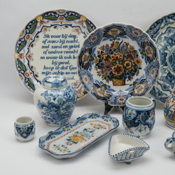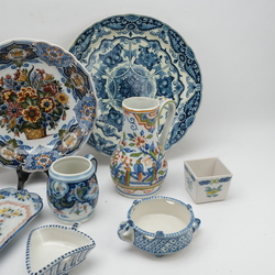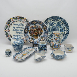 | Omschrijving | Groot lot divers 20e eeuws Tichelaar Makkum, waaronder een grote spreukschotel en een schenkkan. |