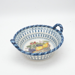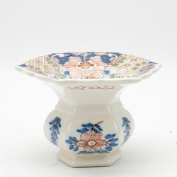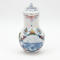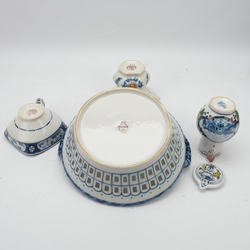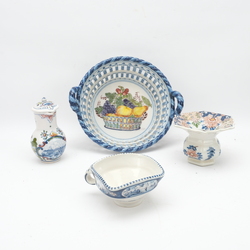 | Omschrijving | Lot van vier stuks Tichelaar Makkum: een aardewerken fruitmand met polychroom bloemdecor, een dekselkannetje met landschapsdecors in medaillons, een test met landschapsdecor en een polychroom gedecoreerde kwispedoor |