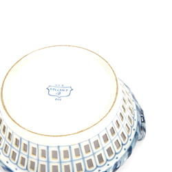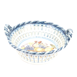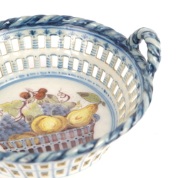 | Omschrijving | Een 20e eeuws aardewerken mandje met opengewerkte rand en gevlochten sierrand, met twee grepen. Aan de binnenzijde op het plat polychrome beschilderd van een gevulde fruitmand. Onderop gemerkt 'Holland' en gekruiste T's = Tichelaar Makkum, ca. 1950. |