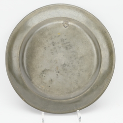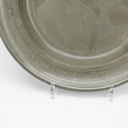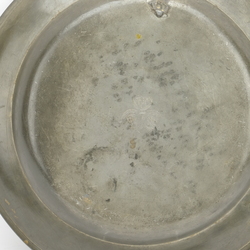 | Omschrijving | Een antieke tinnen schotel met voorstelling van Luther en inscriptie op de rand, gemerkt met drie tinmerken. |
