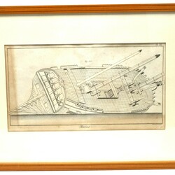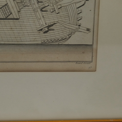 | Omschrijving | Twee 18e eeuwse Franse maritime gravures op papier. Scheepsvoorstelling van een schips interieur en droogdok en schip slagzij. Gesigneerd in de druk Bernard Direxit ca. 1788. Gelijst |