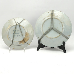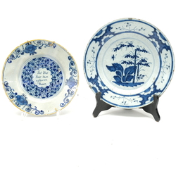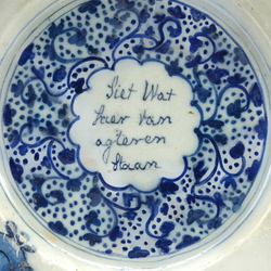 | Omschrijving | Twee 18e eeuwse Delfts aardewerken schotels. Blauw/wit waarvan één met chinoiserie decor. Floraal met een bloemen raden en één met tekst: "Ziet wat hier van agter staat, bid voor u aant eten gaat" |