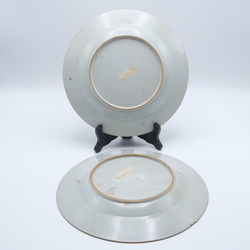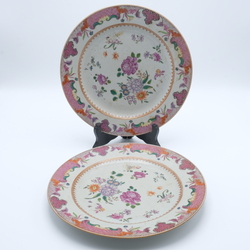 | Omschrijving | Twee indentieke 18e eeuwse Chinees porseleinen Famille rose schotels. Met servetwerk op de randen en florale motieven op het plat.Naar een Europees voorbeeld. |