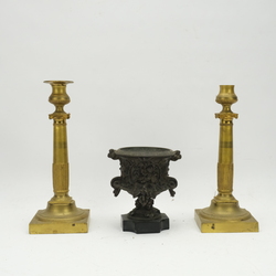 | Kavel | 1030. Twee empire stijl vuurvergulde bronzen kandelaars en een siercoupe |