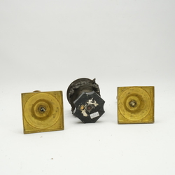 | Omschrijving | Een passend stel bronzen empire stijl vuurvergulde kandelaars.Kolomvormig op vierkante voet. Hierbij een bronzen siercoupe op natuurstenen sokkel. Coupe versierd met diverse voorstellingen van musicerende Putti |