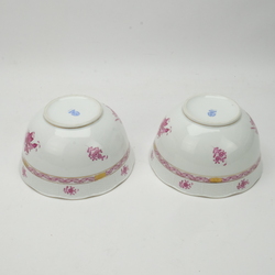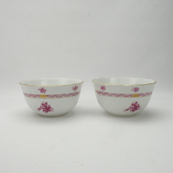| Omschrijving | Twee porseleinen kastkommen met een bietenrood floraal decor. Patroon Apponyi. Gemerkt Herend Hungary. |