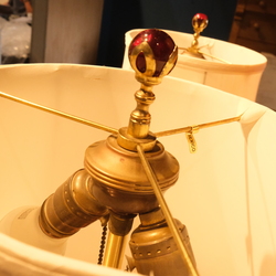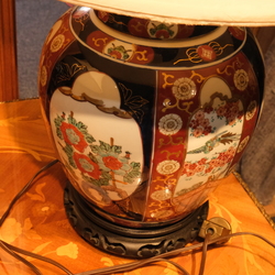 | Omschrijving | Lot van twee 20e eeuwse Japanse gold imari tafellampen met wit stoffen kap, op hout sokkel |