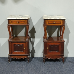 | Omschrijving | Lot van twee antieke 19e eeuwse mahoniehout gefineerde nachtkastjes met marmeren bladen |