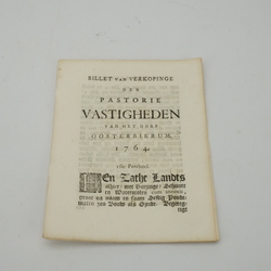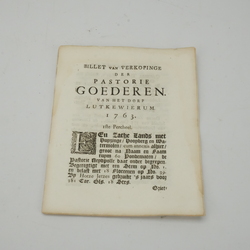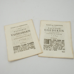 | Omschrijving | Lot van twee 18e eeuwse historische pamfletten: ‘Billet van Verkopinge der pastorie vastigheden van het dorp Oosterbierum’ uit 1764 en ‘Billet van Verkopinge der pastorie goederen van het dorp Lutkewierum 1763’. |