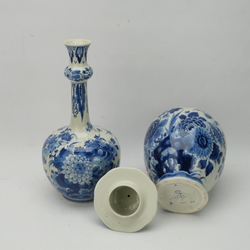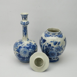 | Omschrijving | Twee diverse aardewerken vazen in het Delfs blauw. Een dekselvaas en een balustervaas. Beide met florale decors. Gemerkt de Porceleyne fles. |
