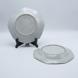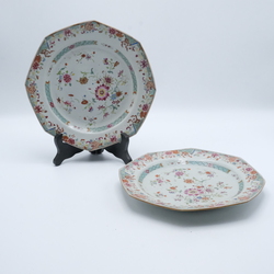 | Omschrijving | Twee gelijke octonale 18e eeuwse Chinees porseleinen schotels. Famille Verte met florale motieven op de randen en het plat. |