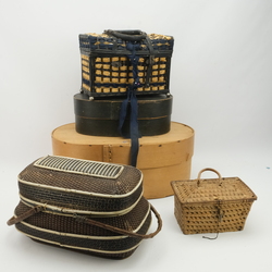 | Omschrijving | Lot van twee spaander dozen en drie mandjes, waaronder een spoormandje |