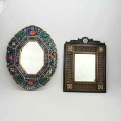 | Omschrijving | Een octonale spiegel in een lijst met achterglas geschilderde florale decors en een vierkante gefacetteerde spiegel in een houten met been ingelegde lijst. |