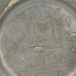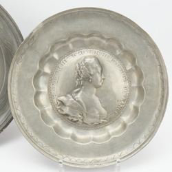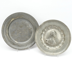 | Omschrijving | Lot van twee antieke tinnen schotels, één met portretmedaillon, voorstelling van Marie Anthoinette en tekst op de binnenrand, één avondmaalsschotel met voorstelling van engelen en tekst ‘IHS’. |