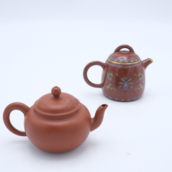 | Omschrijving | Lot van twee 20e eeuwse Chinese yixing theepotjes. Beide gemerkt, één geglazuurd en met beschildering |