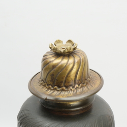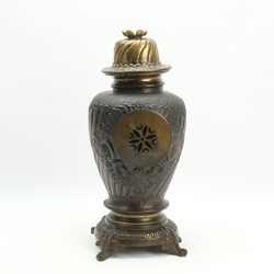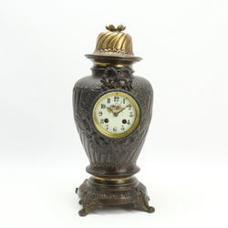 | Omschrijving | Een antieke Franse metalen vaasvormige pendule met emaille wijazerplaat, bekroond met strikmotief |