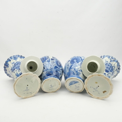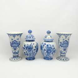 | Omschrijving | Vier aardewerken Delfts blauwe vazen. Twee met trompetvormige halsen en twee dekselvazen. Floraal rondom beschilderd in het blauw/wit. Diverse jaartallen en schilders. Gemerkt De porceleyne fles. |